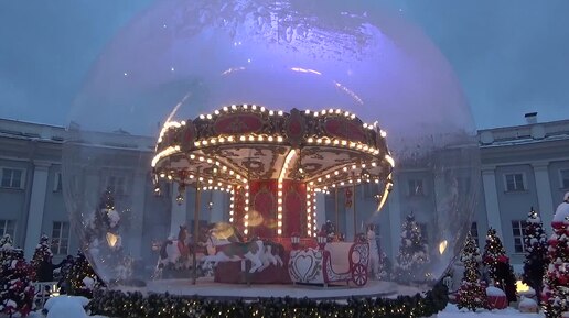 Сказочный снежный шар с каруселью и новогодние ёлки в саду у НИИ имени Склифосовского