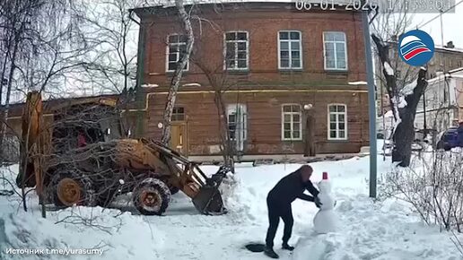 Русская душа с добрым сердцем: тракторист перенёс снеговика во время расчистки снега