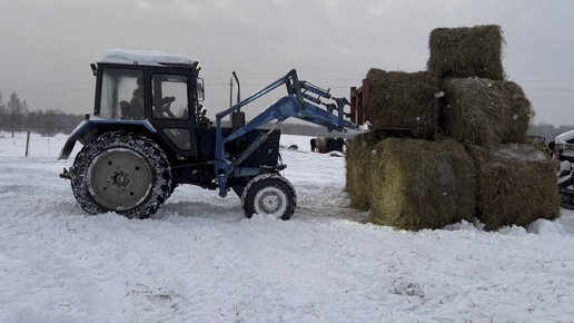 Работа трактора : разгрузка сена. Механизированная разгрузка рулонов . Вкусное сено для наших коров .