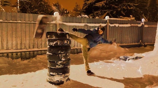 Серии ударов ногами на скользкой поверхности. Супер упражнение с шинами.