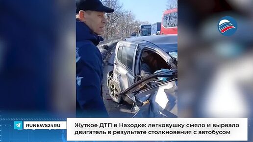 Жуткое ДТП в Находке: легковушку смяло и вырвало двигатель в результате столкновения с автобусом