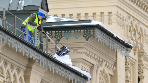 Столичные коммунальщики-экстремалы вышли на уборку снега с крыши без страховки