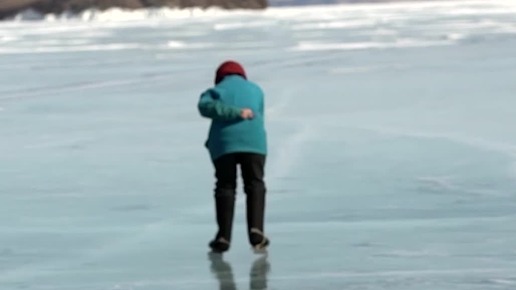 Пенсионерка катается на коньках по Байкалу