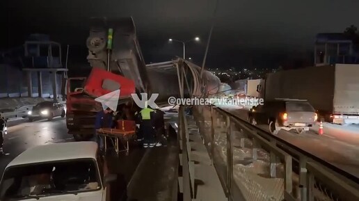 Самосвал с поднятым кузовом снес пешеходный мост на трассе М-4 «Дон»