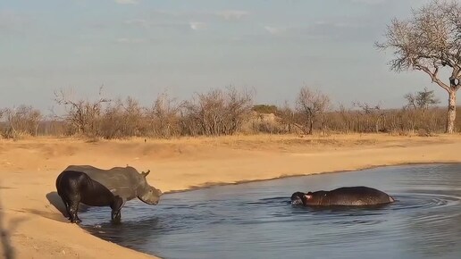 Бегемот помешал носорогу принимать ванну и чуть за это не поплатился – видео