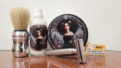 Посредственный станок из нержавейки Kampfe St03-B03P с лезвиями Bic Chrome, мыло и лосьон M.O.W Black Heart, помазок кабан Omega