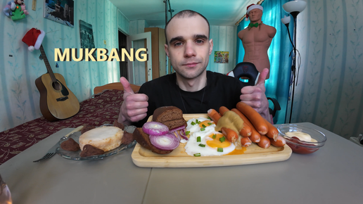 МУКБАНГ СОСИСКИ БАВАРСКИЕ / ЯИЧНИЦА / ХЛЕБ БОРОДИНСКИЙ / ПИРОЖНОЕ СМЕТАННИК / КОНФЕТЫ / ЕДА / АСМР