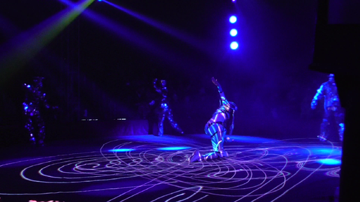 Артисты выступают в костюмах. Зеркальное лазерное шоу в цирке.