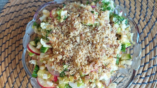 Салат овощной с редисом с жареными солёными бобами. Заправлен ароматным кунжутным маслом.
