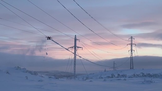 Дрон очищает провода от снега