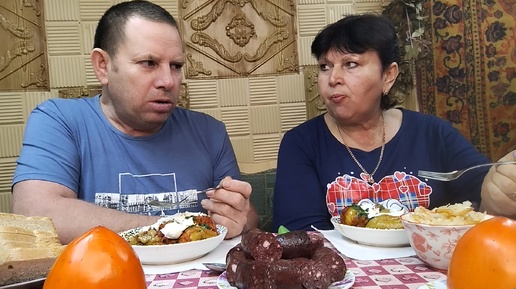 Мукбанг 😋👍. Домашний перец фаршированный, кровяная колбаса, сметана, хурма.
