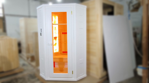 Видеообзор угловой окрашенной снаружи белой эмалью кедровой ик-сауны с инфракрасными нагревателями