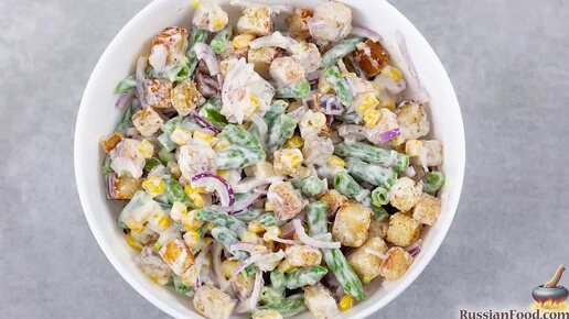 Быстро, легко и вкусно. Попробуйте! Салат с кукурузой, фасолью и сухариками