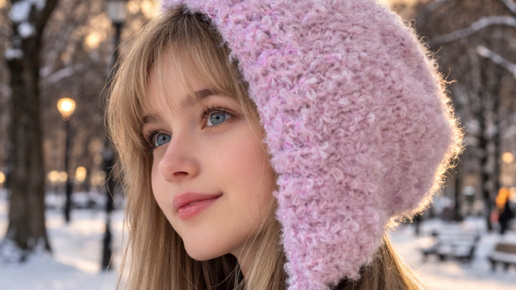 Шапка капор ручной вязки, букле, нежно-сиреневый цвет
