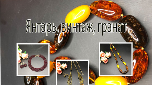 Бусы с янтарём. Комплект с винтажным бисером. Колье с гранатом. Повторы.