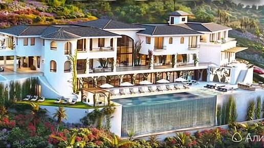 большой дом с бассейном и водопадом