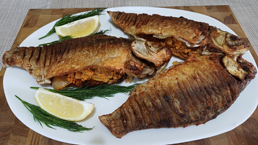Жареный карась, фаршированный икрой и луком.