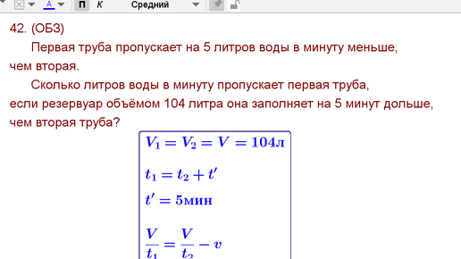 А. Ширяева. ЕГЭ. ПРОФ. 2026.10. Текстовые задачи. Задачи на работу 42. Первая труба пропускает на 5 л воды в минуту меньше, чем вторая.