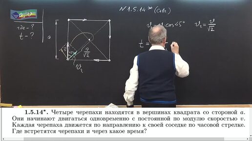 Олимпиадная задача на определение места и времени встречи четырех черепах движущихся по сторонам квадрата
