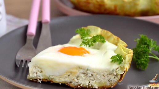 Красивый завтрак в сковороде. Пицца из лаваша с яйцами и творогом