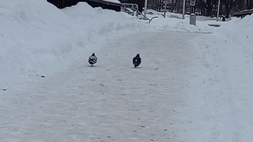 HD Два голубя уходят вдаль по заснеженной дороге. 20260224_100227