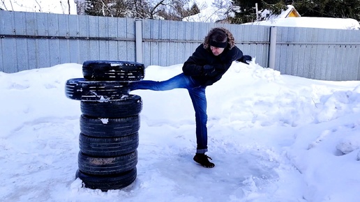 Удары ногами на гололёде. Тренировка на развитие общей координации.
