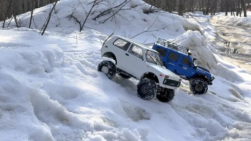 RC Нива катается в лесу по мокрому снегу)