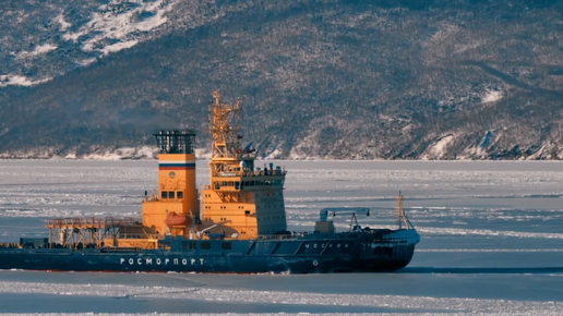 Видео: Ледокол «Москва» помогает торговым судам пройти через лед в бухте Нагаева и обеспечивает работу порта Магадан