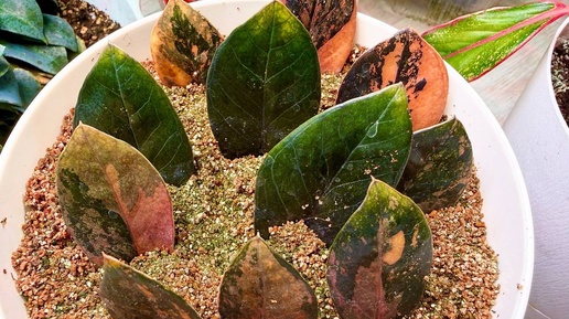 Результаты укоренения через 1,5 месяца листьев замиокулькаса очень редкого и дорогого вариегатного сорта Блэк Пинк