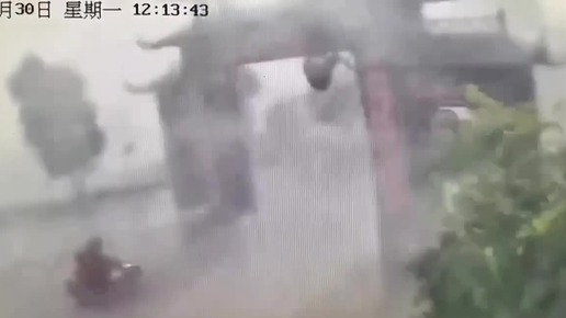 В китайском городе Чаочжоу во время мощного урагана обрушились исторические ворота, едва не придавив прохожего