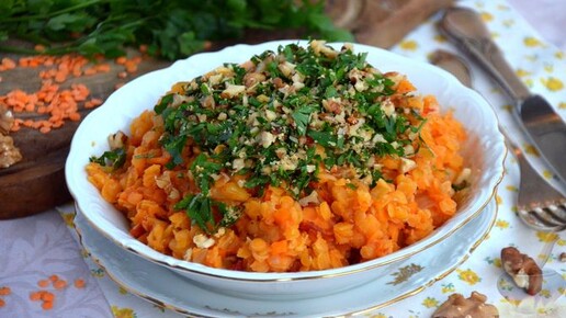 Свежесть зелени и приятный ореховый вкус. Чечевица с помидорами и орехами