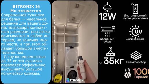 Интеграция умной потолочной сушилки BITRONIX I6 Multifunction в белом цвете в постирочную в рамках дизайн-проекта от KurilovDesign