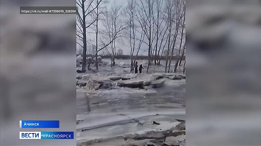 В Ачинске дети балуются на льдинах, которые выдавливает из реки Чулым