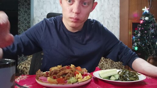 Мукбанг// Разноцветные Макароны С Мясом И Овощами Морская Капуста И Огурчик