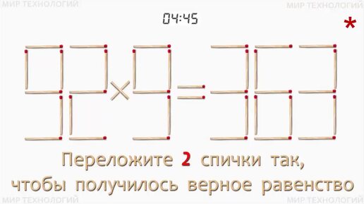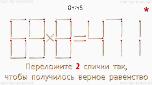 Публикация доступна с подпискойДля профессионаловДля профессионалов05:011,0×05:01Задача со спичками 457 (2). Переложите 2 спички так, чтобы равенство стало верным (69 х 8=471).8 месяцев назад