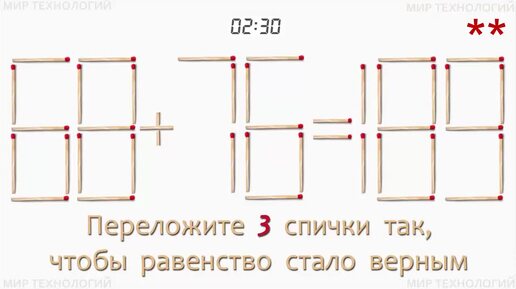 Публикация доступна с подпискойДля профессионаловДля профессионалов05:011,0×05:01Задача со спичками 457 (3). Переложите 3 спички так, чтобы равенство стало верным (68+76=189).8 месяцев назад