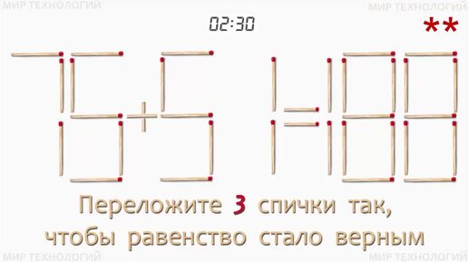 Публикация доступна с подпискойДля профессионаловДля профессионалов05:011,0×05:01Задача со спичками 458 (3). Переложите 3 спички так, чтобы равенство стало верным (75+51=188).8 месяцев назад